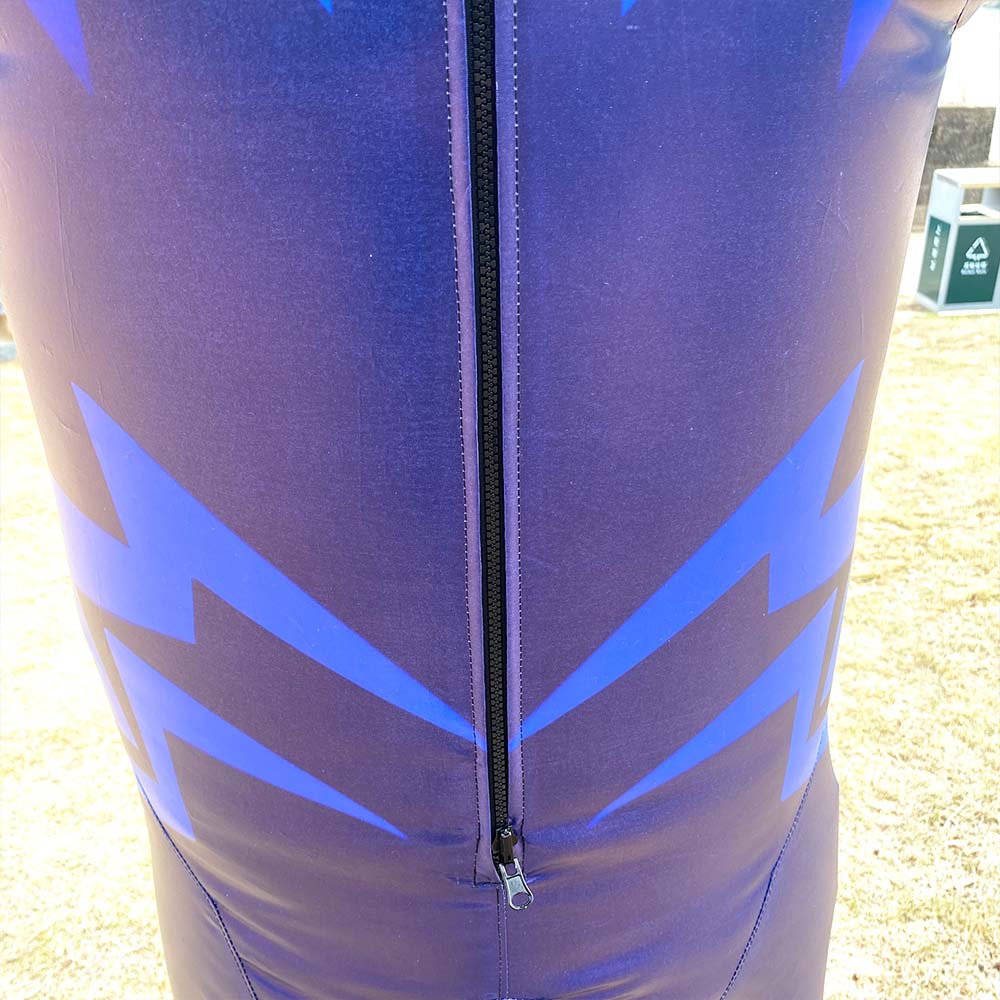zipper can rotate 360 degrees. It can be easily closed while you are inside the inflatable suit. It can be easily put on by one person.